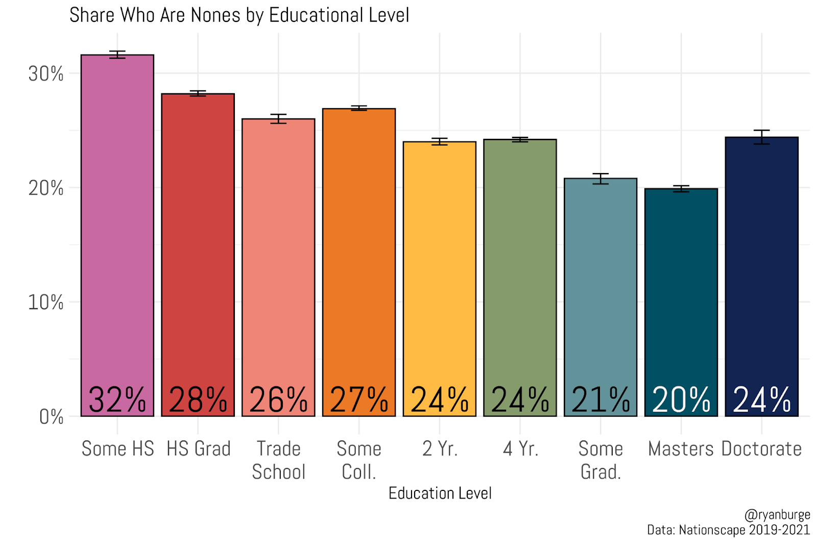 For long-time readers of this work, there’s no surprise here—educated people are less likely to be religious nones. These differences are pretty linear, too. Among folks who stopped at high school, 28% are non-religious. For those who finished a four-year college degree, it’s four points lower than that. But the level of education that yields the lowest percentage is clearly folks with master’s degrees. Only 20% of them are nones.