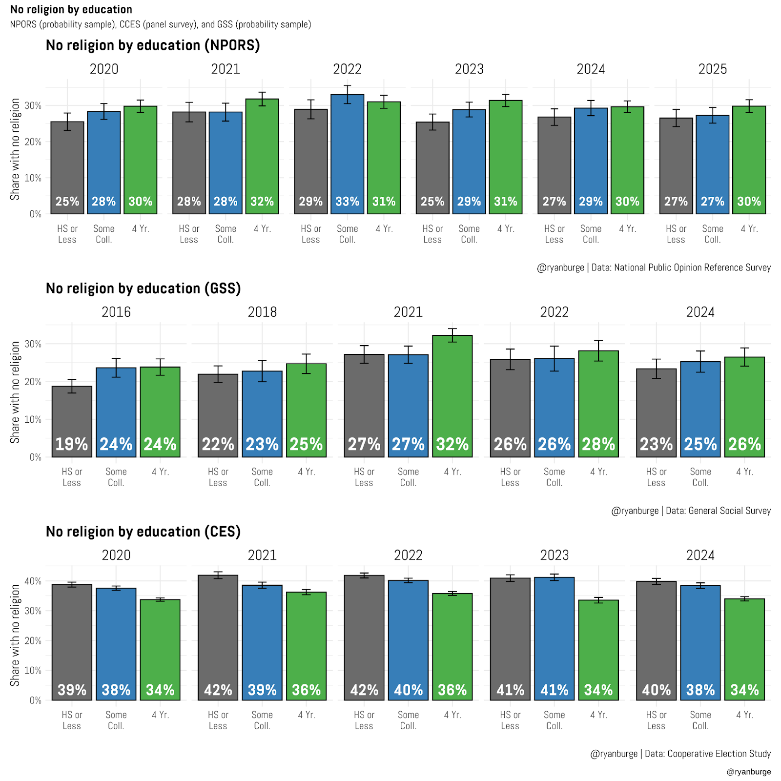 But here’s the thing—variables about religious affiliation and education are in almost every single survey that’s being conducted right now. So let me show you that same relationship (education and religious affiliation) across three other survey instruments: Pew’s National Public Opinion Reference Survey (NPORS), the General Social Survey, and the Cooperative Election Study.