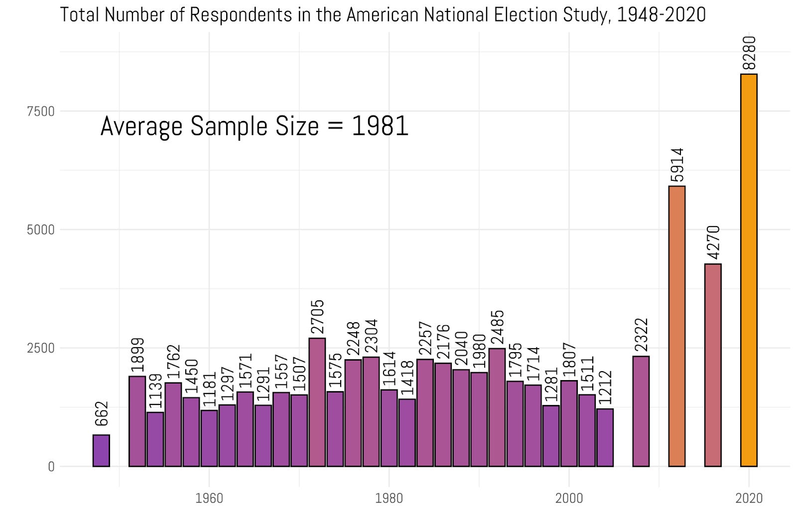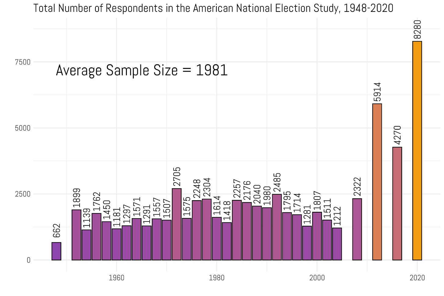 The backbone of longitudinal statistical analysis of American politics is the American National Election Study (ANES). It’s been fielded with consistency since 1948. (By the way, there’s almost no publicly available survey data before that date). You can see the total sample size of each year that the survey was collected since its founding over 75 years ago.