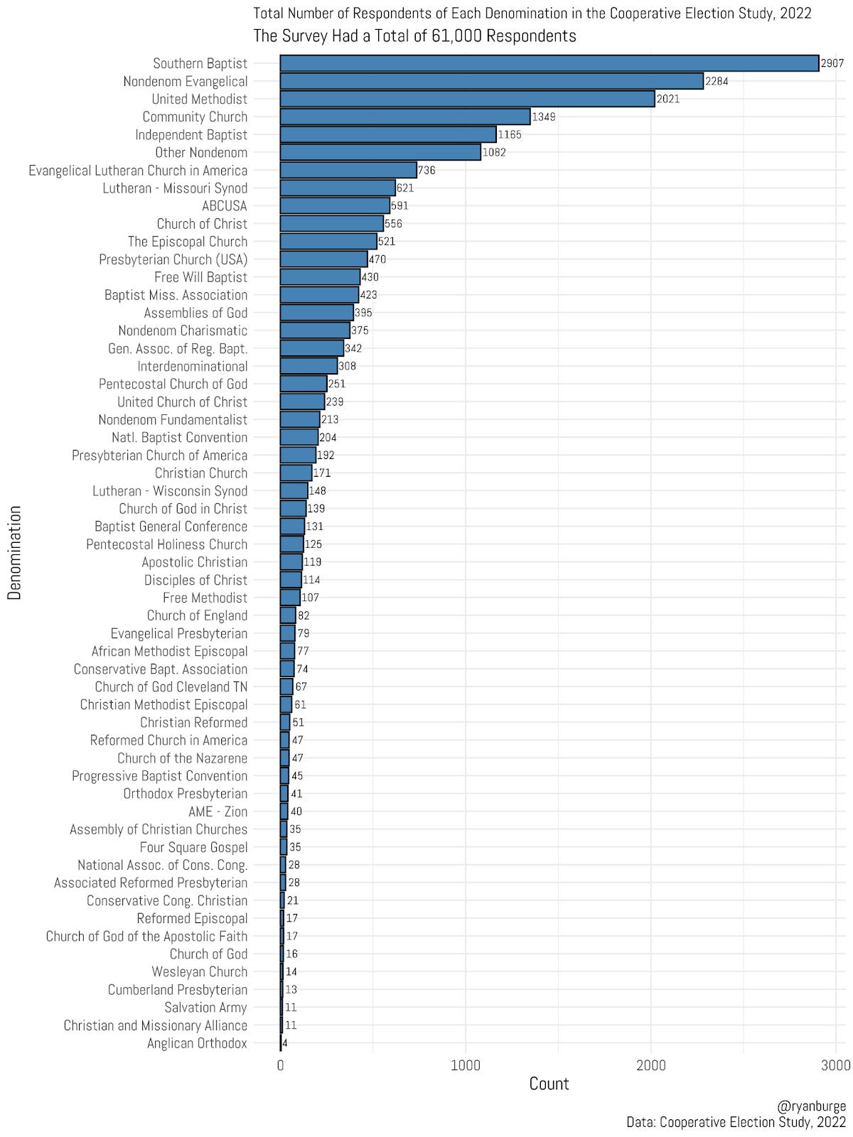 That’s how I created the very first graph in this post. I just took the 40 denominations that had the most respondents and calculated the proportion who said they voted for Donald Trump. This is how many people were in each denomination in the 2022 Cooperative Election Study. Remember, this is a total sample of 61,000 Americans.
