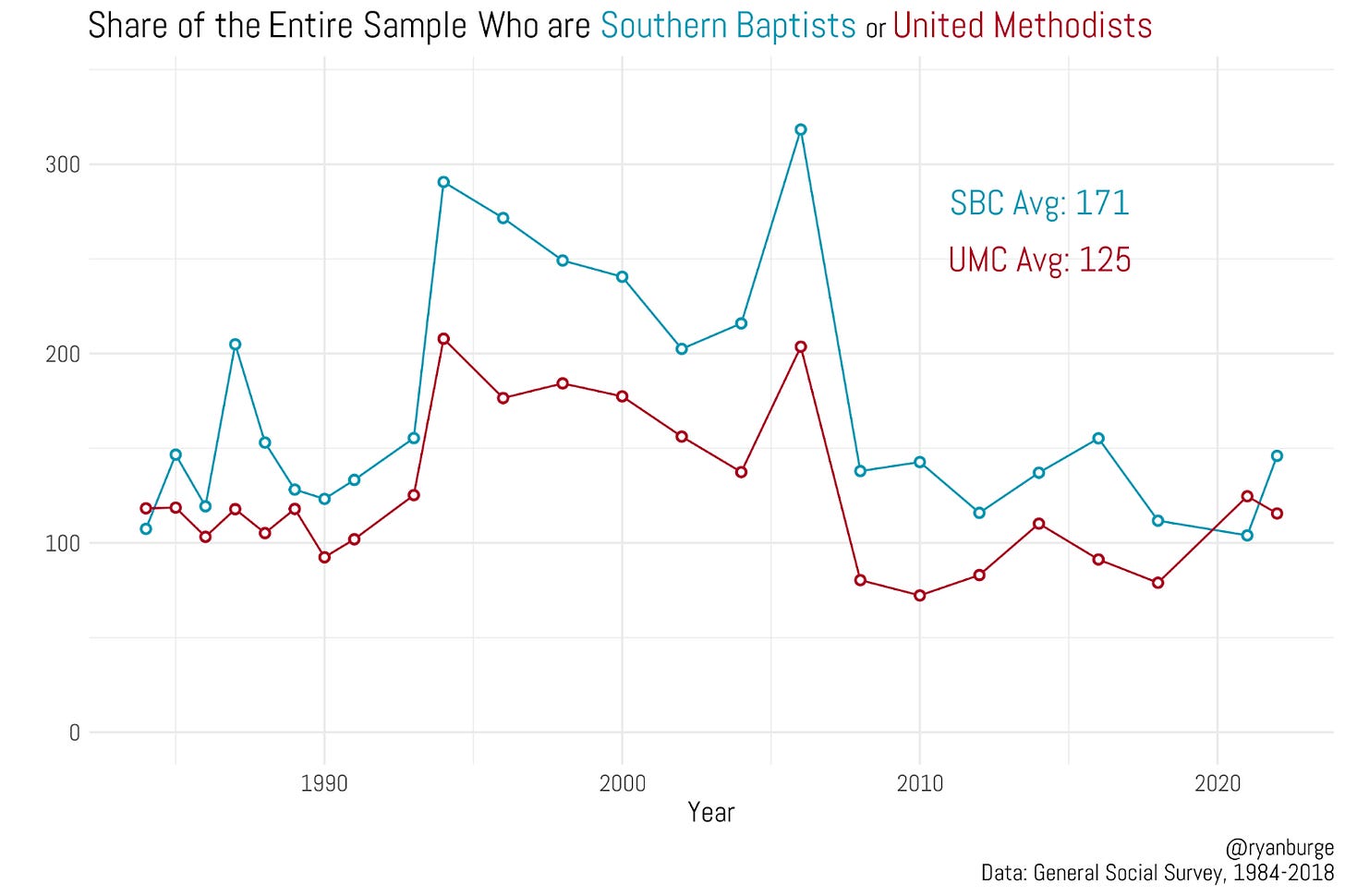 Practically speaking, a young scholar of American religion and politics two decades ago had an incredibly limited set of questions that they could try and answer with the data available. Let me show you what I mean. I took the two largest Protestant denominations in the United States over the last fifty years: the Southern Baptist Convention, and the United Methodist Church and then counted the number of folks who were in each tradition in the GSS over the last fifty years.