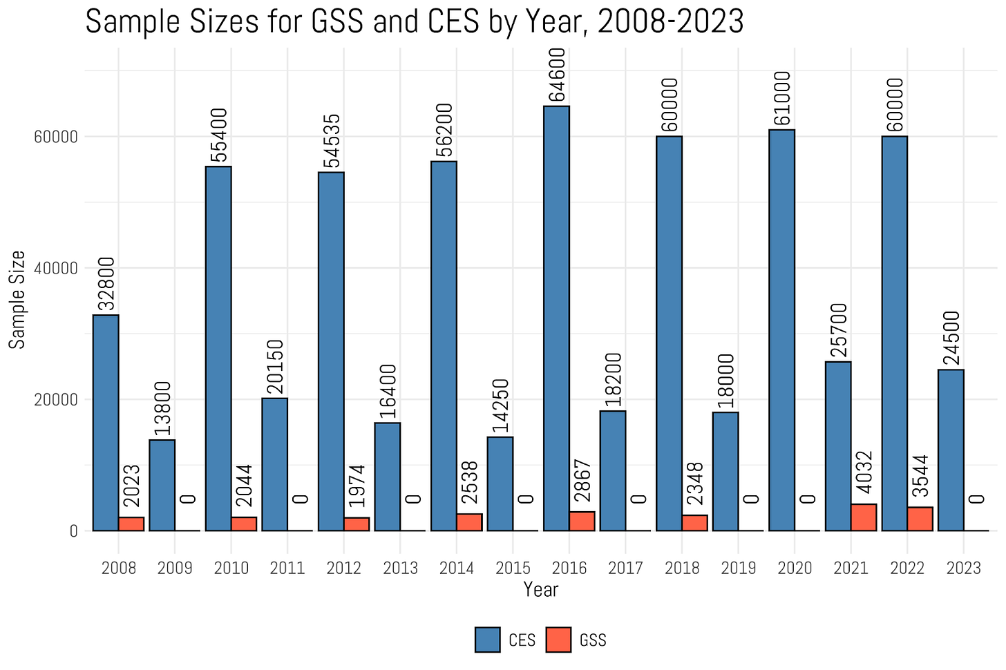 The smallest sample of the CES was in 2008 when they only polled 32,800 people. From there it just exploded. In an election year, the sample has been consistently about 60,000. I've heard the 2024 sample size is actually north of 75,000. Which is just mind-boggling when compared to such a paucity of data we had for decades. To put that number in perspective, the entire time series of the GSS, which spans fifty years and 34 different collection periods, has a total sample size of 72,390. The CES polled more people than that in just 2024.