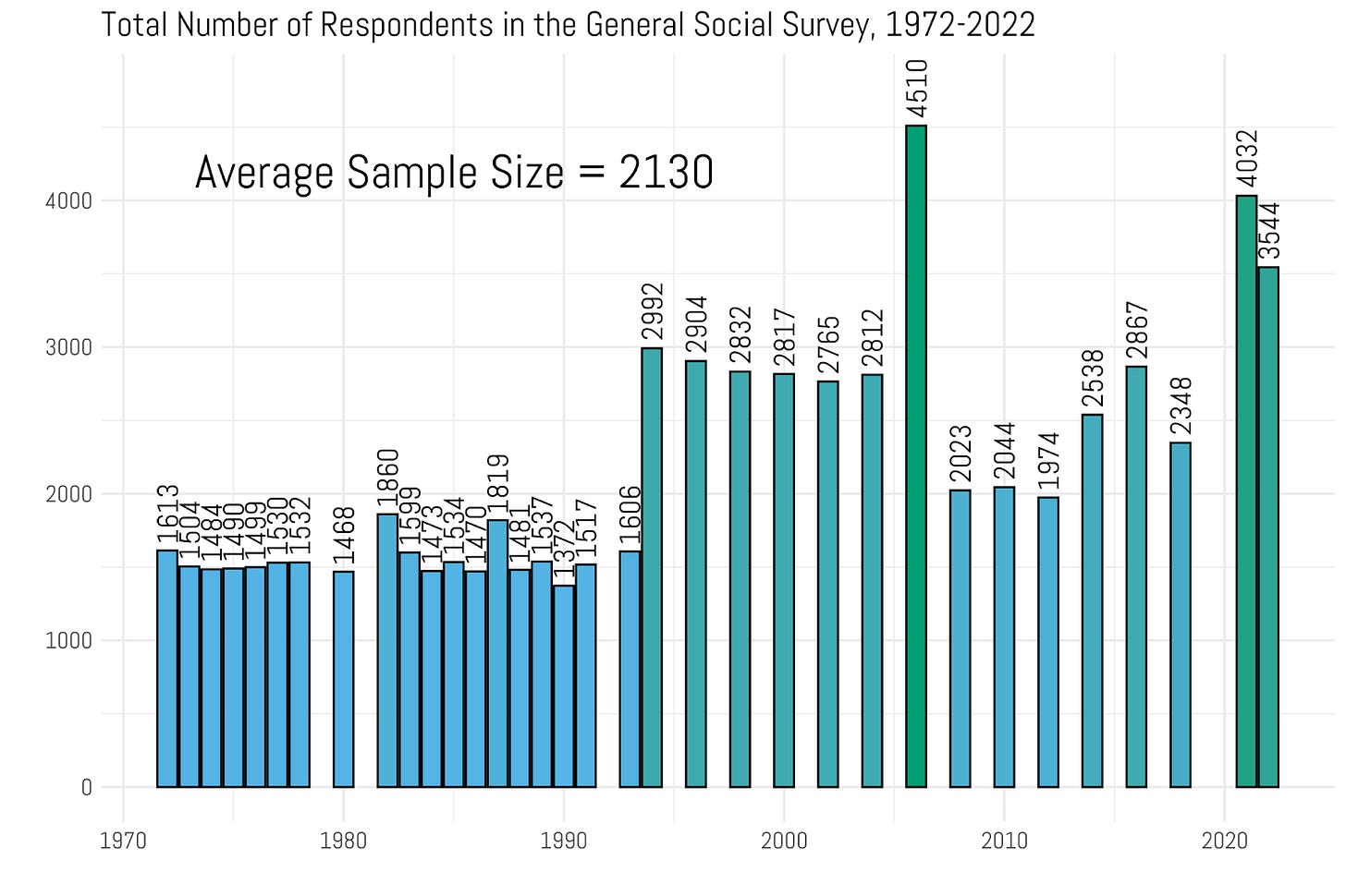 You can see the same problem here, right? The sample size is not that large. From the period that began in 1972 and ran through the early 1990s, the average sample was just about 1500 folks. It did jump up from there, though. In the 2000s it was a total collection that was much closer to 3000. The last couple of waves have been pretty robust, too - 3500 in 2021 and 4000 in 2022. That’s moving in the right direction. However, the GSS average sample is only 2,130. This is what I was confronted with when I was working through my master's thesis and doctoral dissertation - a lot of the questions that I really wanted to pursue were just not answerable with the data that I had.