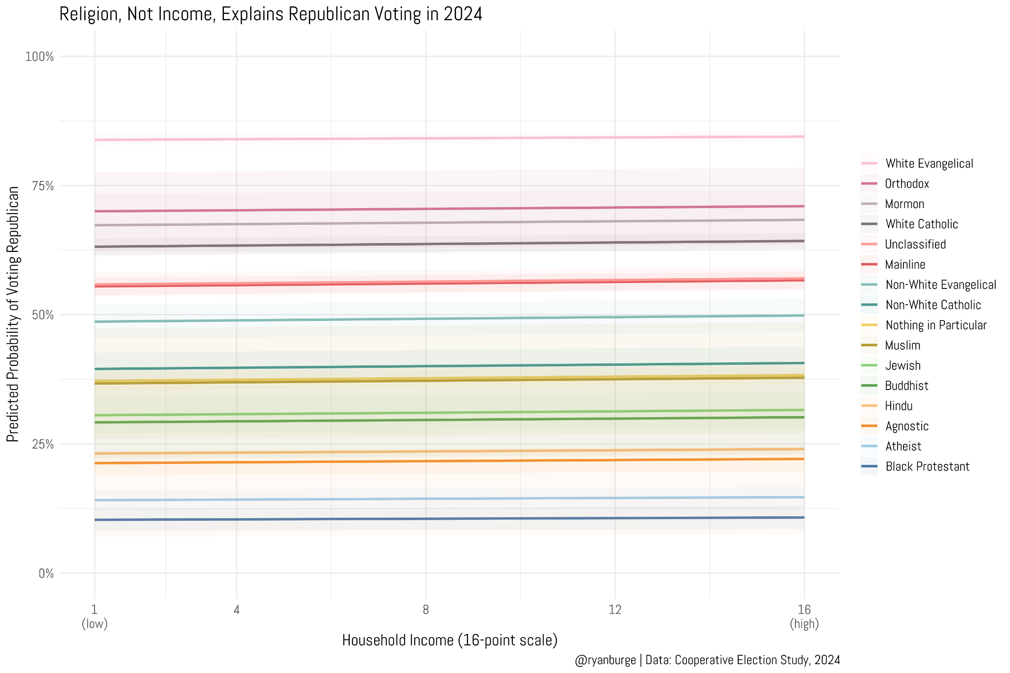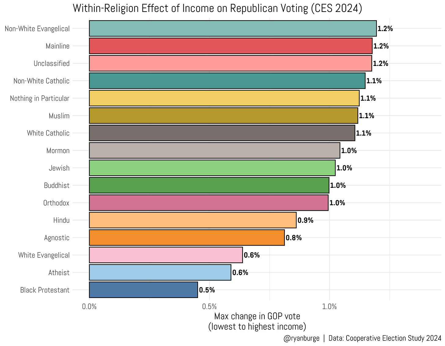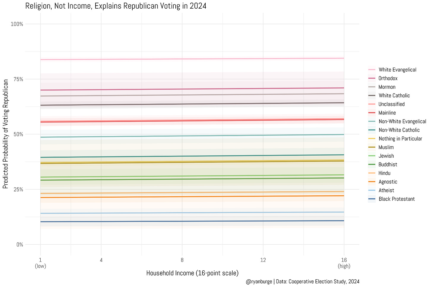 For Latter-day Saints, the difference between the highest earners and the lowest is one percentage point. For white evangelicals, it’s 0.6%. For Black Protestants, just 0.5%. I’m not even going to bring up statistical significance here, because the substantive story is the real key: income simply has no meaningful impact on vote choice within these religious traditions.