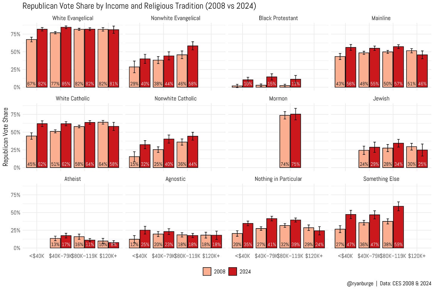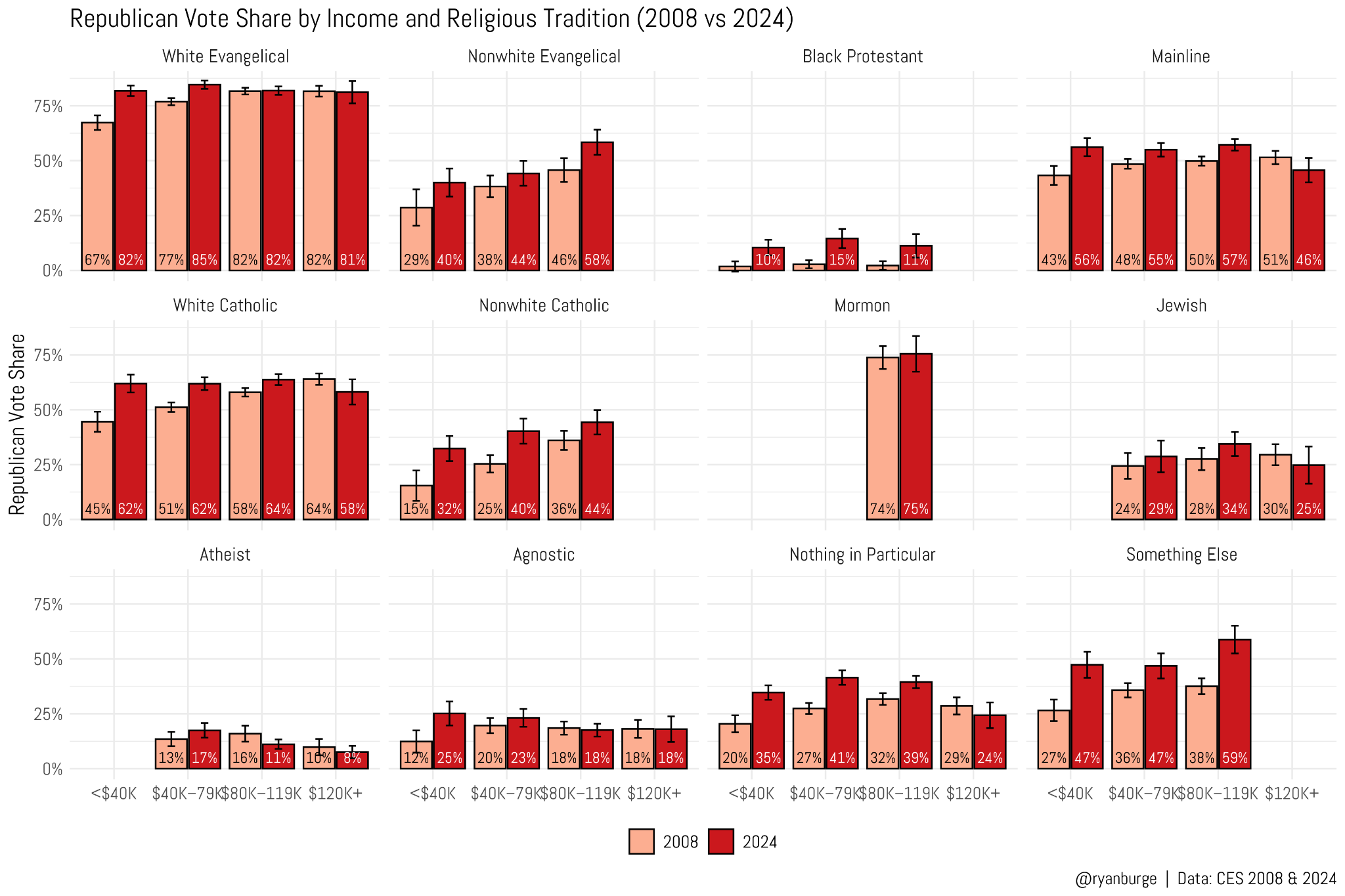 A similar pattern pops up in several other traditions. Among white Catholics, Republican gains among lower-income respondents are noticeable. You see the same thing among mainline Protestants. But once you look at the higher end of the income scale, the differences between 2008 and 2024 shrink dramatically. In most groups, vote choice among higher earners barely budged.