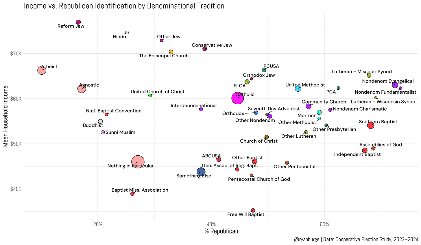 And then there’s… the right-hand side of the plot. I’m not even sure “cluster” is the right term—it’s more like a theological traffic jam. Most of the Protestant traditions pile up there, with median incomes in the $50–$60K range but wildly different partisan profiles. That actually creates some fascinating contrasts. Members of the United Church of Christ, for instance, have almost the exact same average income as people who identify as non-denominational. Yet the partisan breakdown could not be more different: about 29% of UCC respondents are Republicans, compared to nearly three-quarters of non-denominationals.