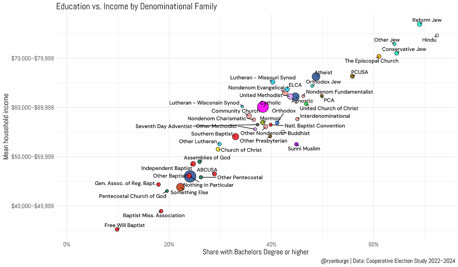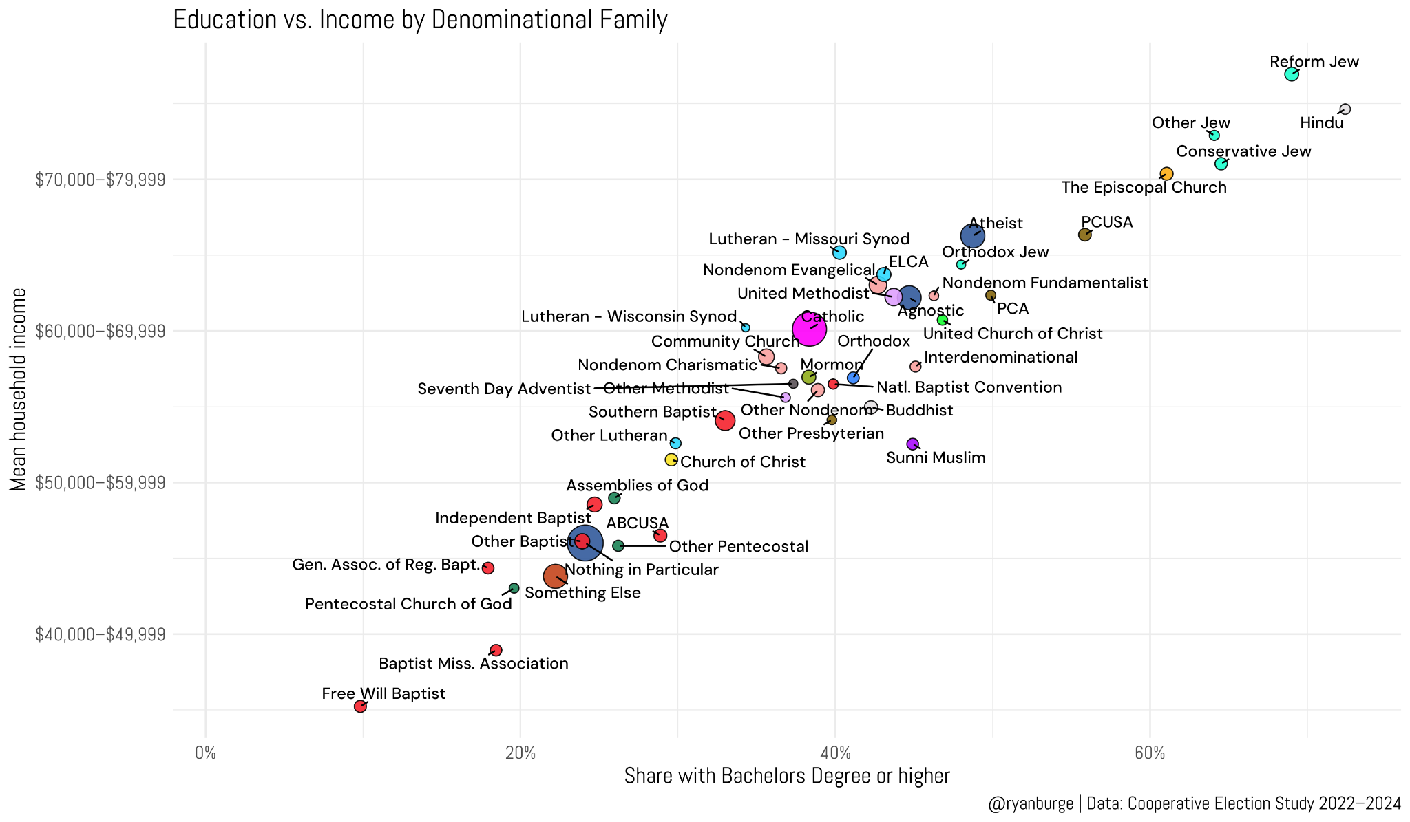 But once you look more closely, some religious patterns emerge that are worth pointing out. A number of Pentecostal traditions cluster in the bottom-left corner of the plot—groups like the Assemblies of God and the Pentecostal Church of God. Moving toward the middle, you find a wide mix of traditions: atheists, Latter-day Saints, Muslims, and a variety of Protestant denominations, all occupying similar socioeconomic territory despite very different theological profiles.
