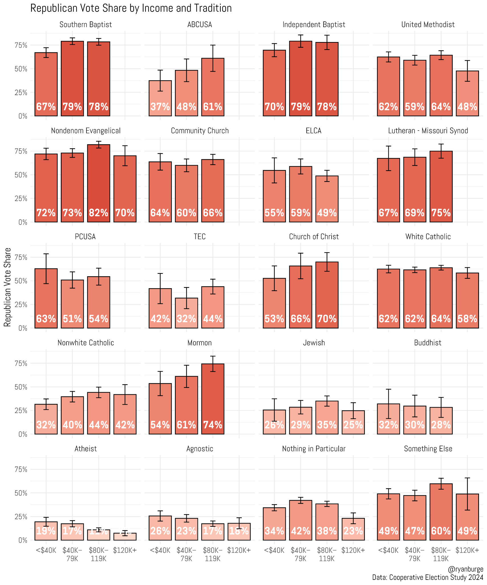 Yeah, I think this graph does an excellent job of conveying just how little income matters on Election Day once you control for religious tradition. Among non-white evangelicals who make at least $500K per year, they are only 1.2 percentage points more likely to vote for Donald Trump than members of the same group making less than $10K per year. And that’s actually the largest gap I found.