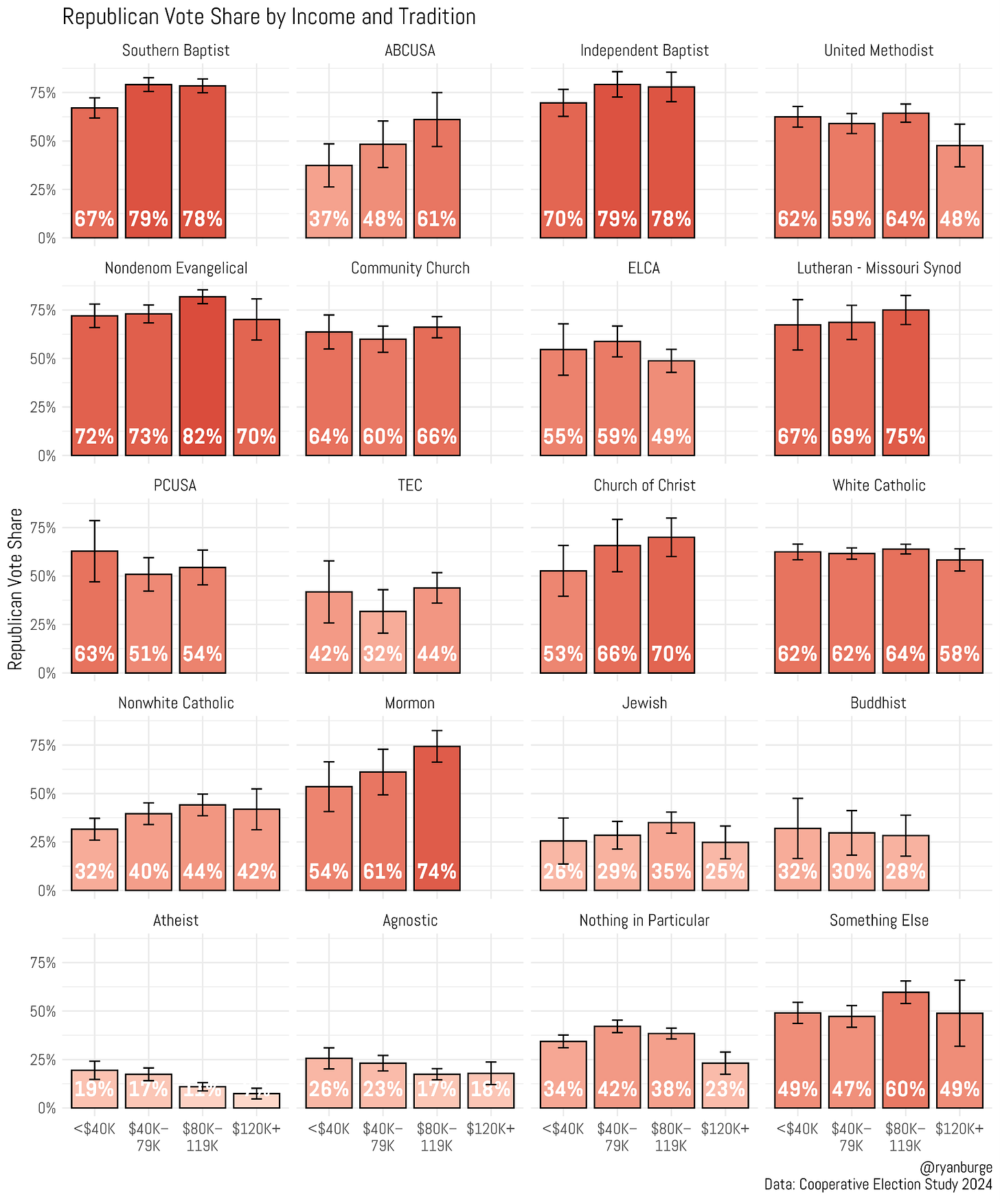 Look at other large traditions. Among United Methodists, there is essentially no difference in Republican support between someone earning $35K a year and someone earning $115K. The same flat pattern shows up among non-denominational Protestants, white Catholics, Jews, Buddhists—you can go group by group and see the same story repeat. Within a religious tradition, income just doesn’t seem to move the needle very much.