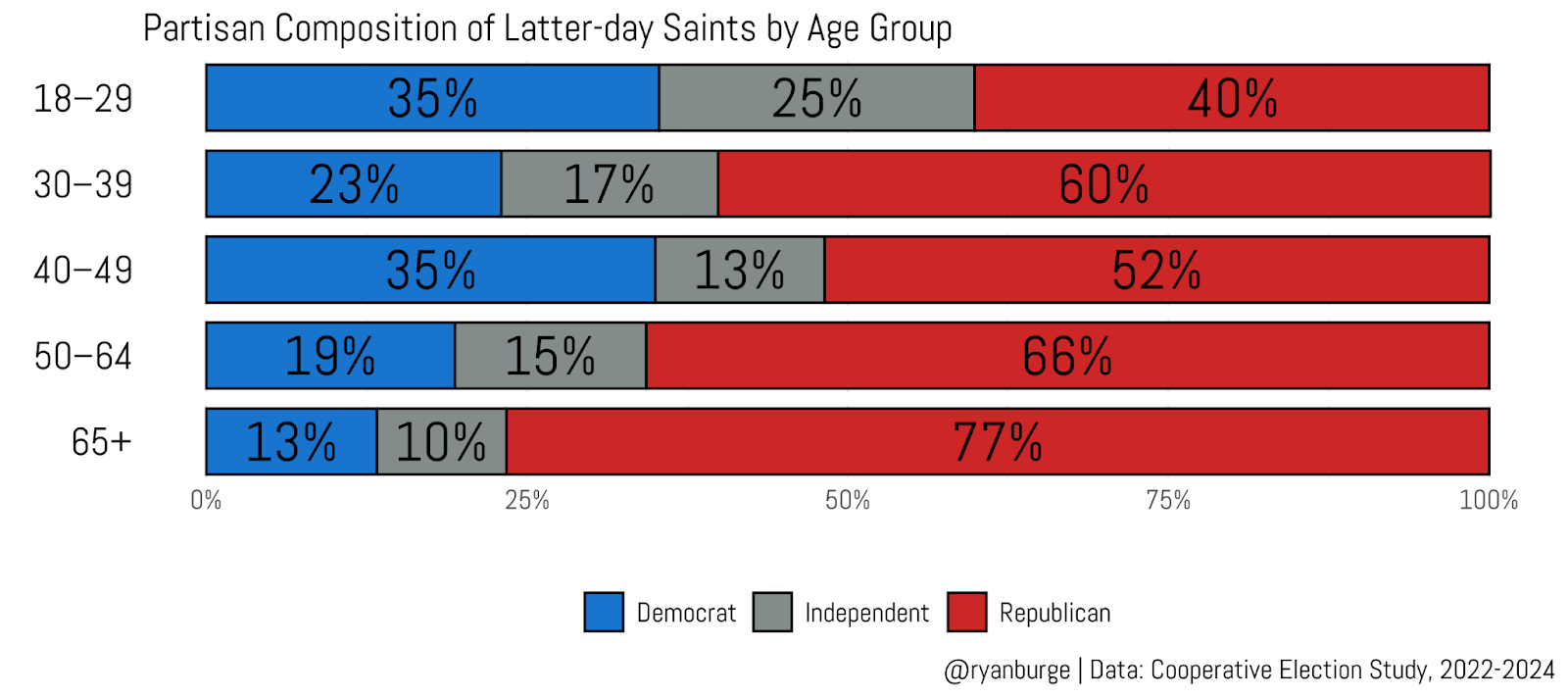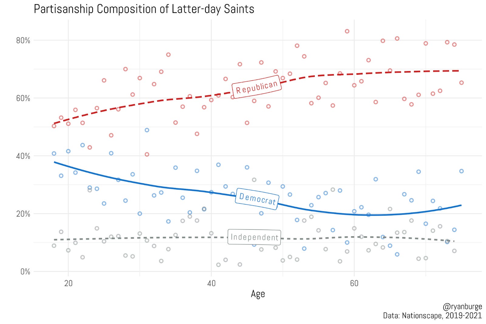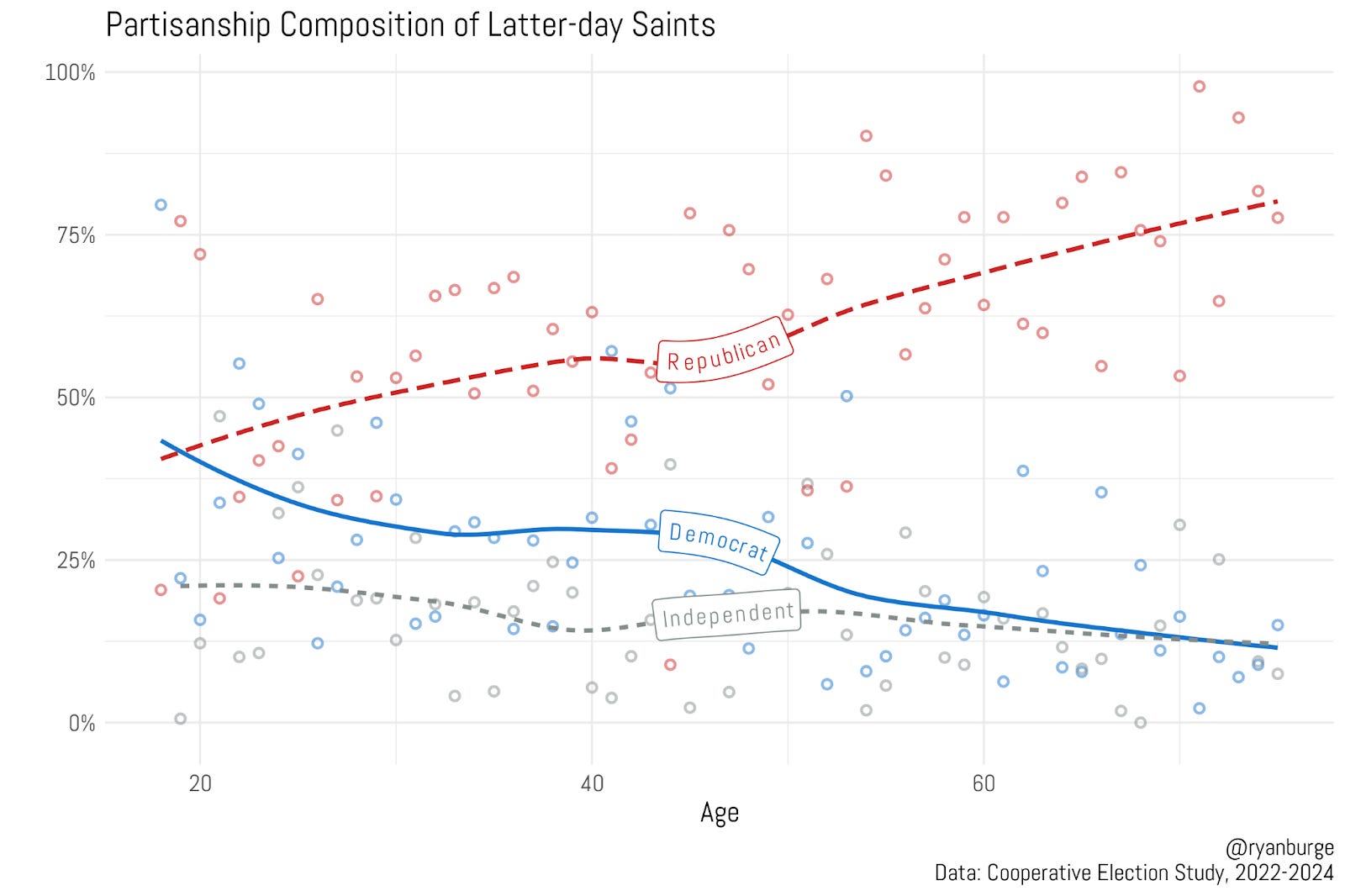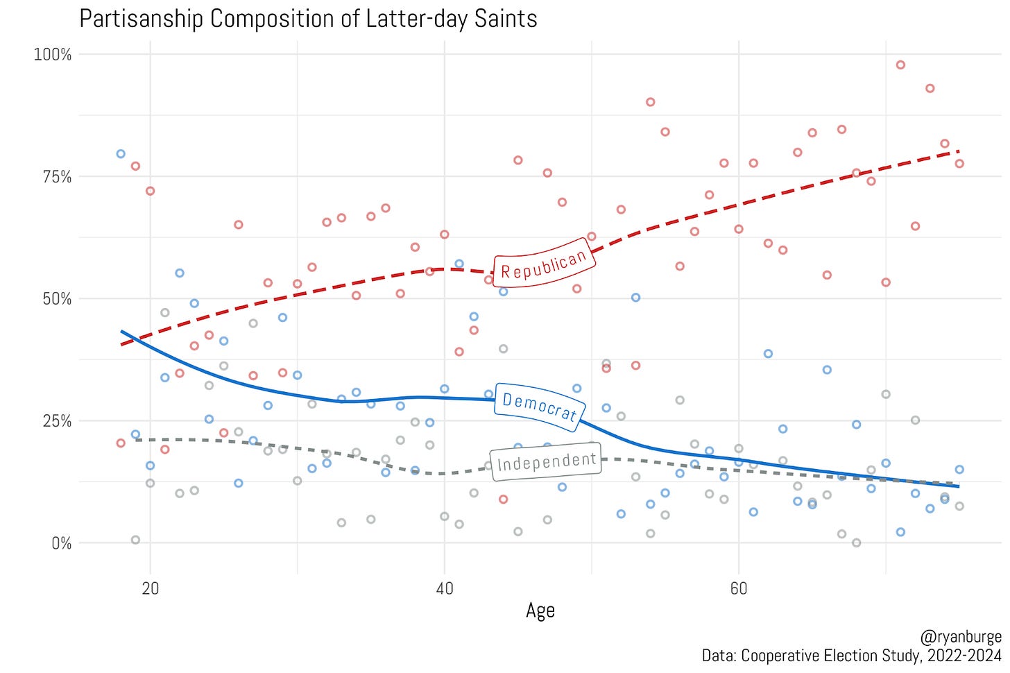 The results for people in their thirties and forties aren’t quite what I expected, though. Ideally, we’d see a smooth trend — a gradual increase in Democrats and a steady decline in Republicans. That’s what usually happens in these kinds of graphs. So, I can’t help but wonder if we’re just seeing some noise here from a small religious group. Still, it’s fair to say that middle-aged Latter-day Saints are roughly 30% Democrats and 55% Republicans.