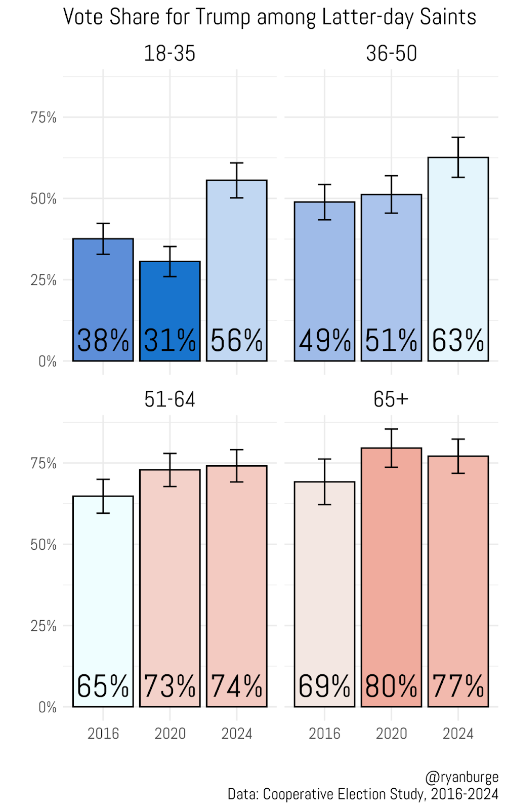 And let me make sure this doesn’t get lost: a majority of Latter-day Saints between the ages of 18 and 35 voted for Donald Trump in 2024. That wasn’t true in either 2016 or 2020. There was also some movement toward Trump among LDS voters aged 36–50. So it’s tough to make the case that younger Mormons are trending leftward when you look at these results.