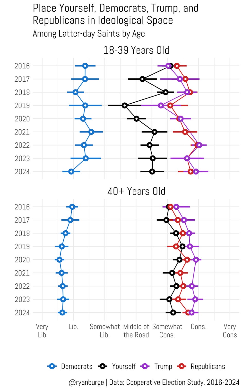 Hi Ryan -- I wonder how much of these results are skewed by people exiting the LDS faith. Jana Riess recently published an article showing that younger LDS are leaving at high rates and that those that stay tend to be more orthodox (which could also mean more conservative politically than liberal). https://religionnews.com/2025/12/10/us-gen-zers-and-millennials-are-leaving-the-lds-church-data-confirms/