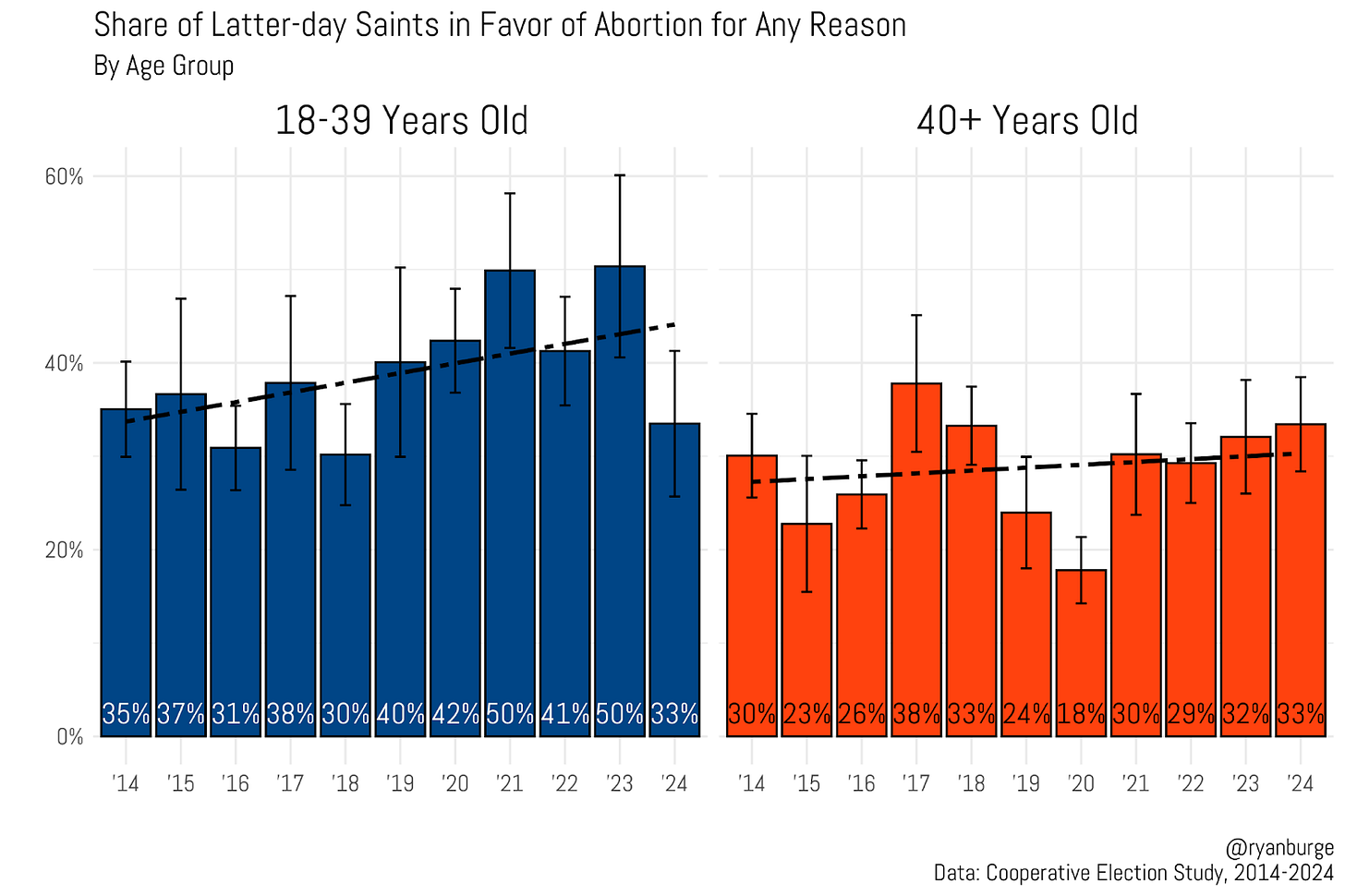 First, let’s start with the 40-and-over crowd. Their views on abortion have basically stayed the same over the past decade — roughly 30% in favor of allowing it. There’s maybe a slight uptick, but that’s probably just noise in the data. A solid majority of older Latter-day Saints continue to oppose abortion access.