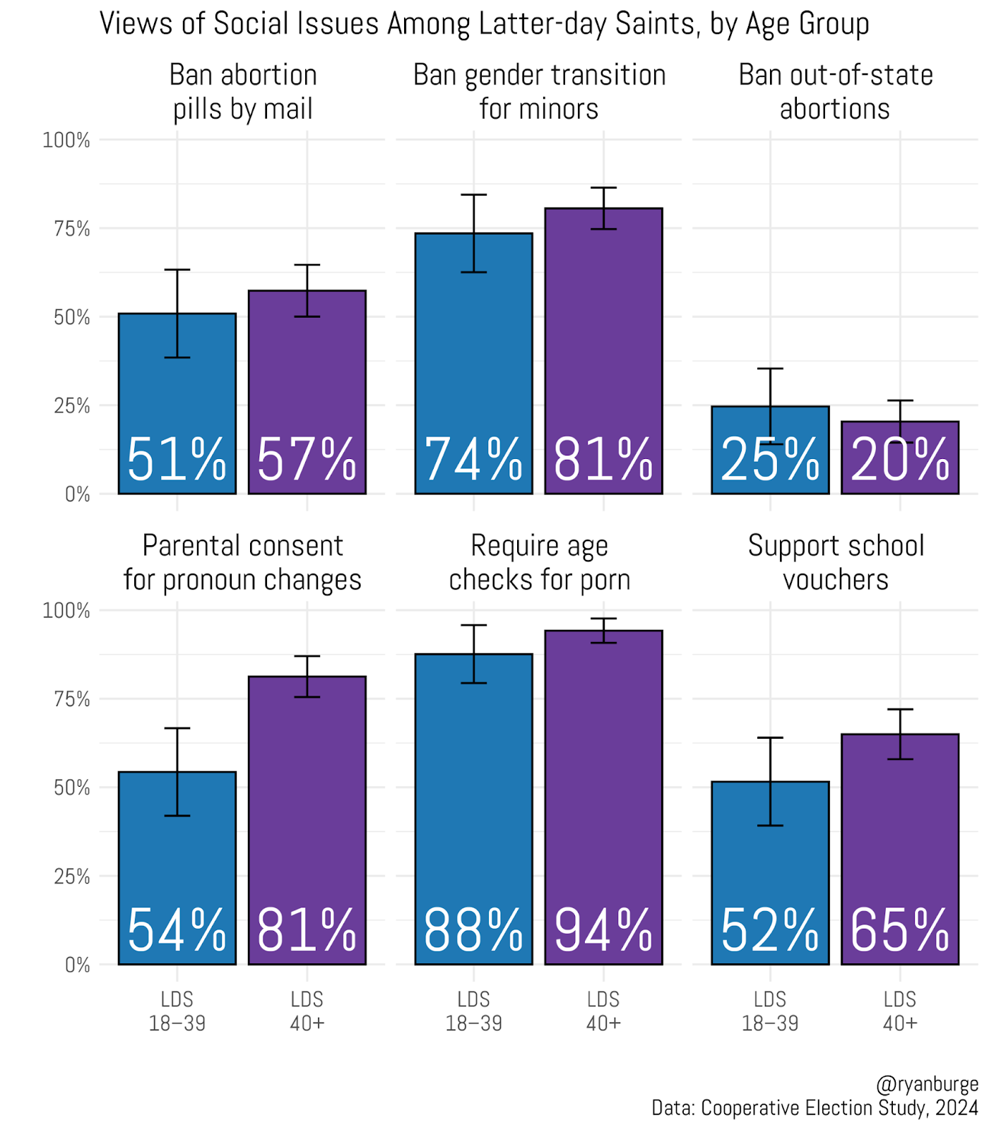 This graph was incredibly instructive in showing how young Latter-day Saints compare to their older counterparts. For example, 51% of LDS ages 18–39 favor banning abortion pills sent through the mail, compared to 57% among those over 40 — a difference that isn’t statistically significant. The same is true for questions about banning gender transition for minors, restricting out-of-state abortions, requiring age verification for porn sites, and supporting school vouchers.